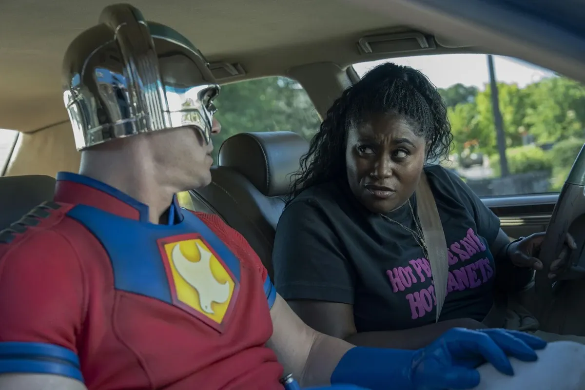 Episode 1 of Season 2 also re-introduces the multiverse into the DCU. In the very first moments, Peacemaker stumbles into an alternate reality where his brother, Keith (David Denman), and father, Auggie (Robert Patrick) aren’t just alive, but a happy and healthy family. It’s a revelation that propels everything that happens in the following eight episodes.
