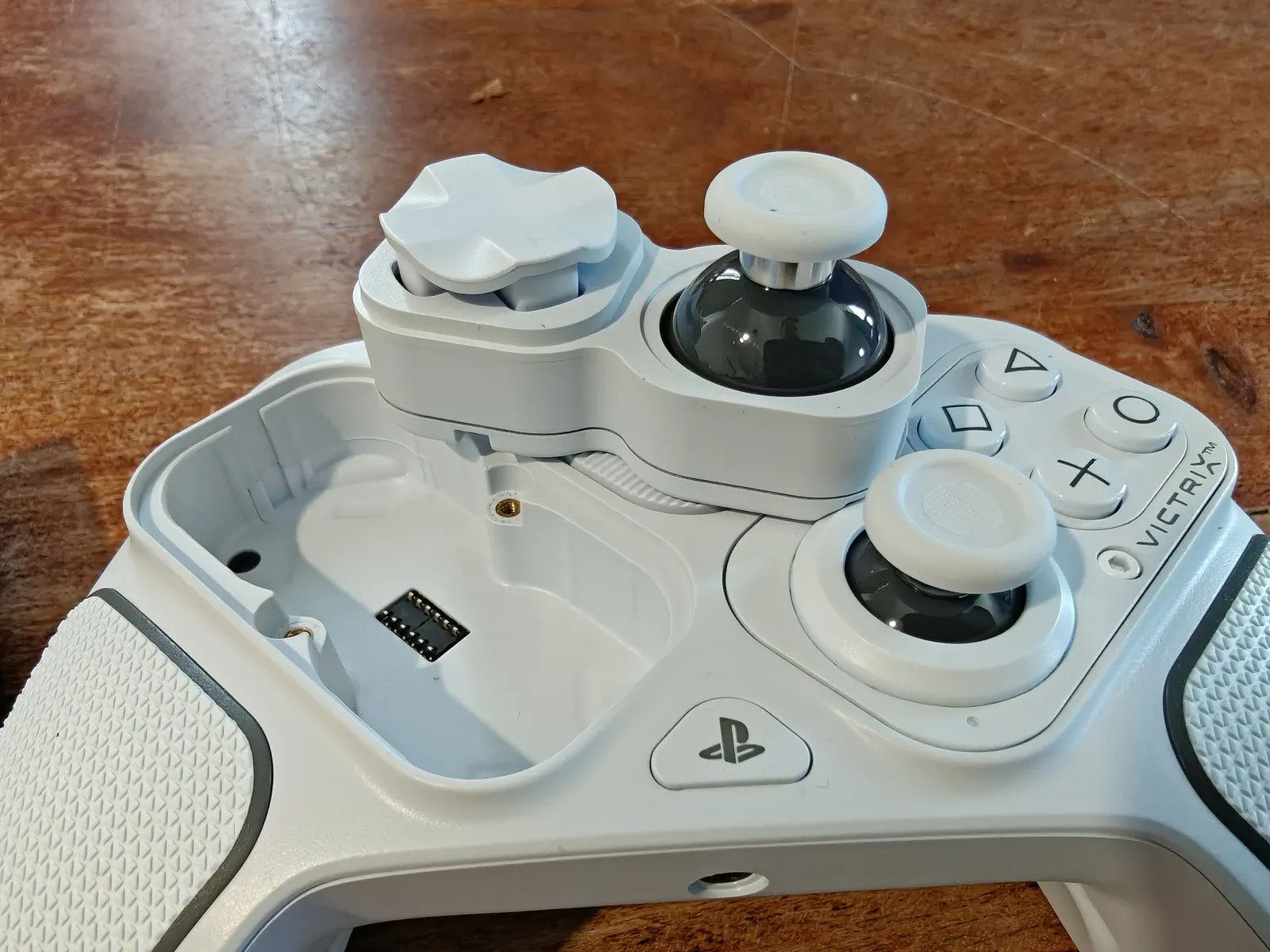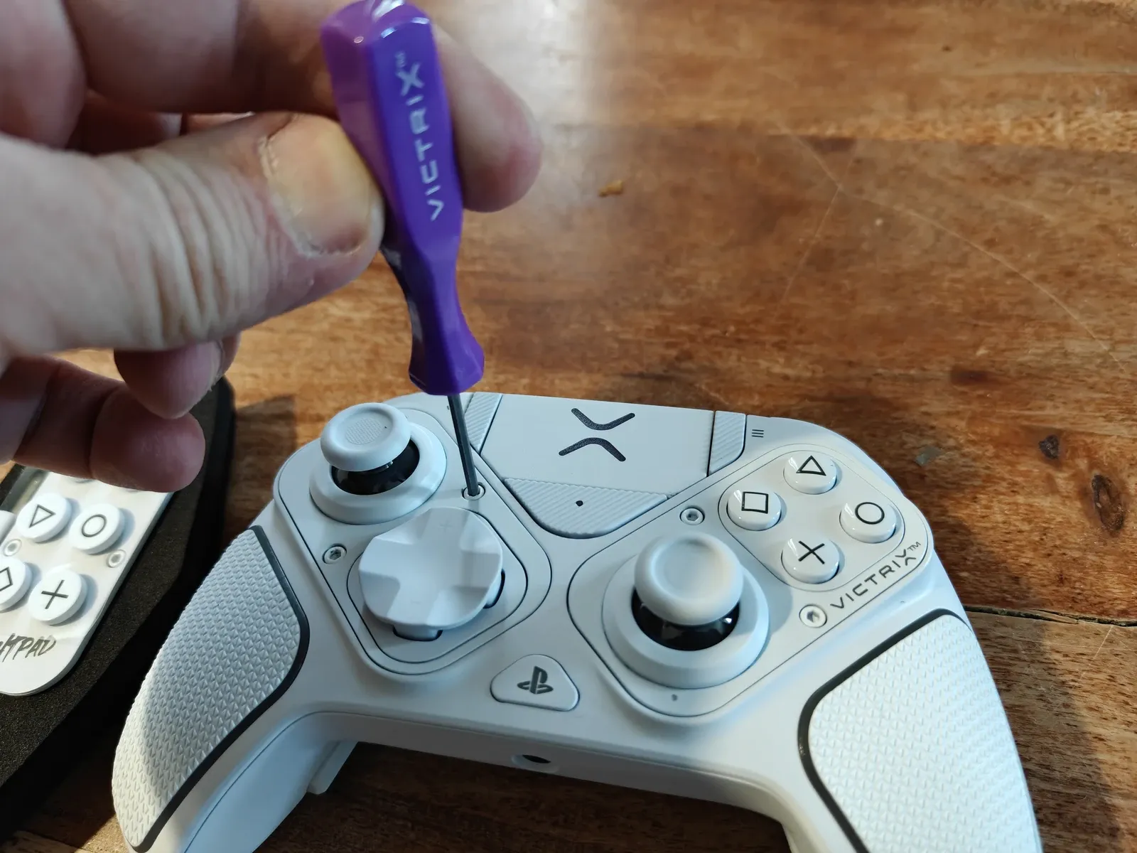 The Victrix Pro is an almost completely modular controller, and you can switch both placement and style of the joysticks and buttons at will. For example, say you want to have the buttons on the left and the directional pad on the right? You can do that. All it takes is to use the supplied screwdriver to unlock the modules, after which they can be swapped out for alternative parts, like a fightpad controller, or even from one side to the other.